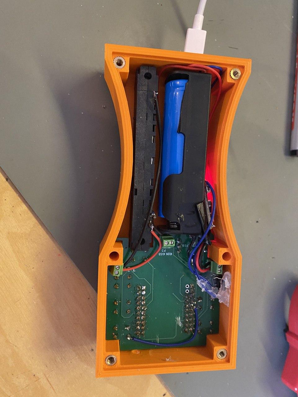 Ich habe hierfür eine fertige Platine genutzt: einfach passendes Loch gebohrt[1] und zwischen Akku und Gehäuse eingeklemmt - Die Gewindeeinsätze sind nun auch da und ich kann das Teil nun zuschrauben.