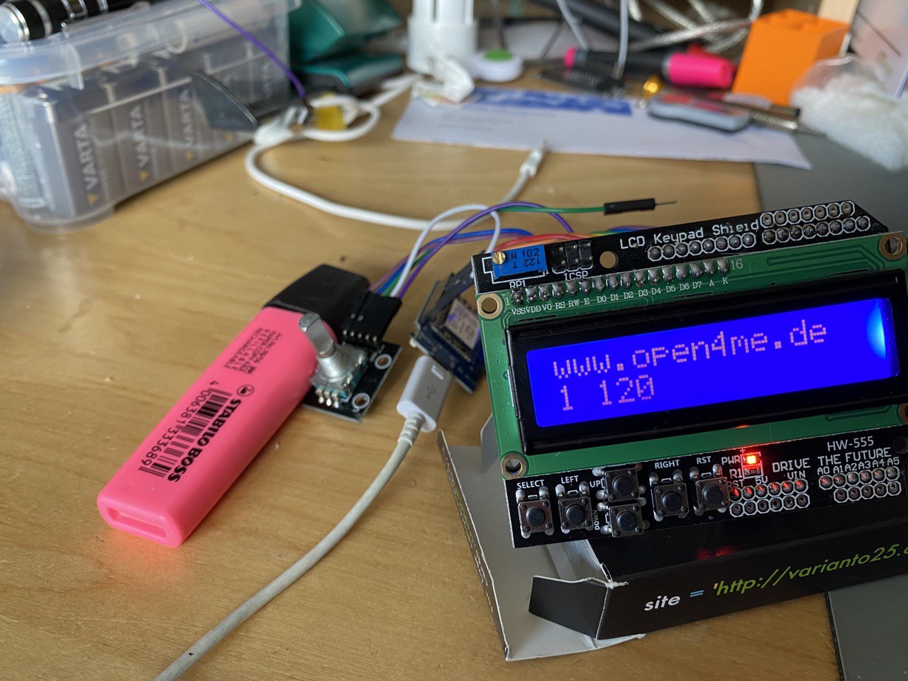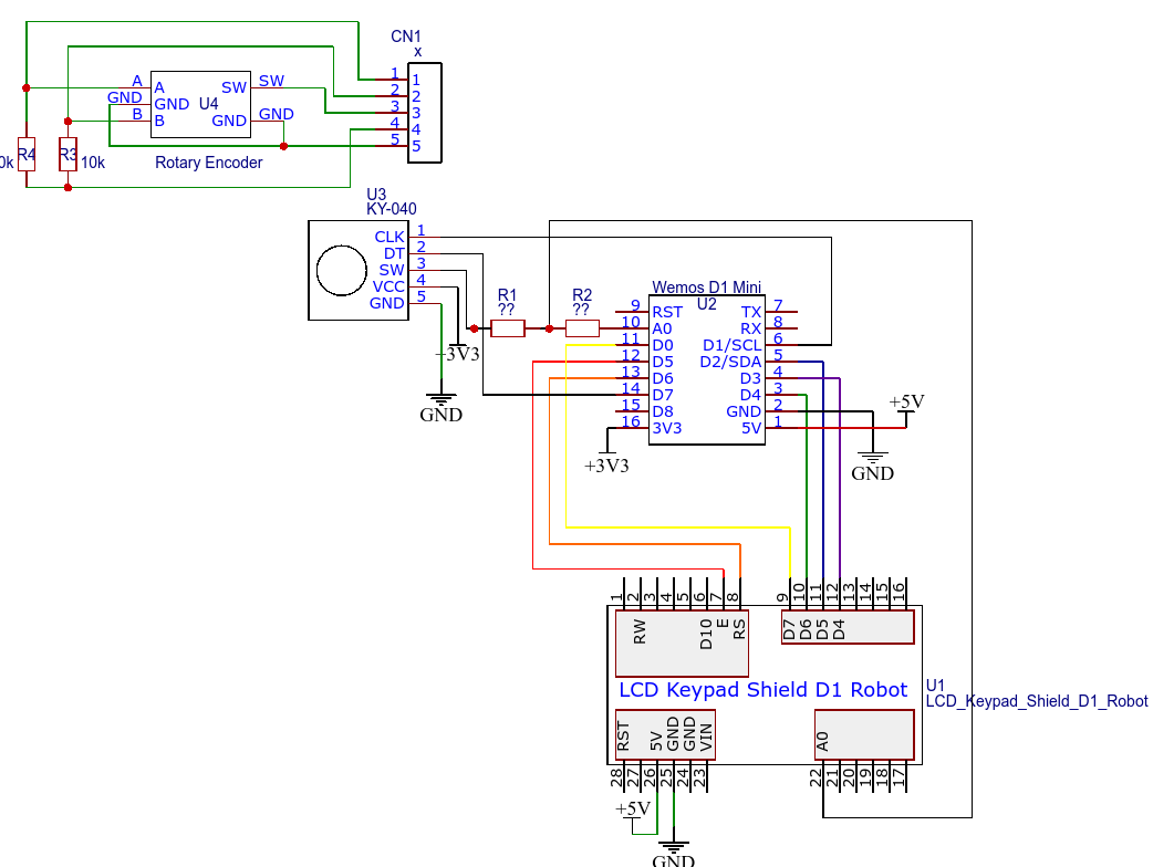 Neben einen D1-Mini, kommt ein einfacher Drehregler und ein Display-Platine[1] zum Einsatz.