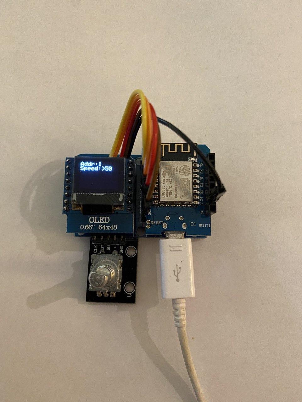 Aktuell kann man mit dem Drehregler die Geschwindigkeit ändern und mit den Tasten unter dem Display die ID.