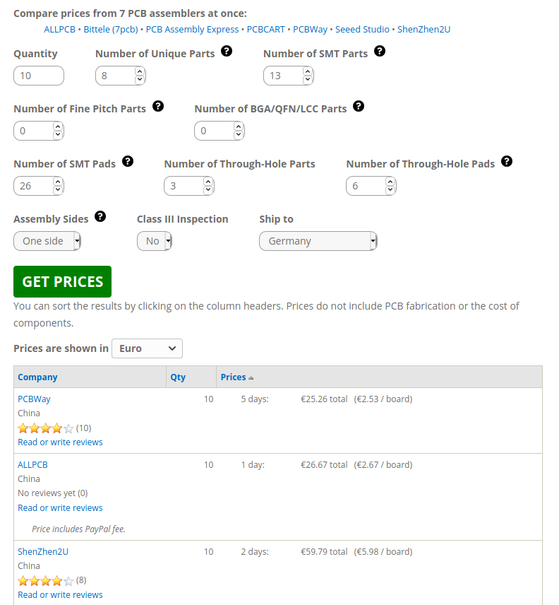 Die Preise für die Bestückung von 10 Platinen ohne Platine (<1$ pro Platine) und ohne Komponente (~2$ pro Platine).