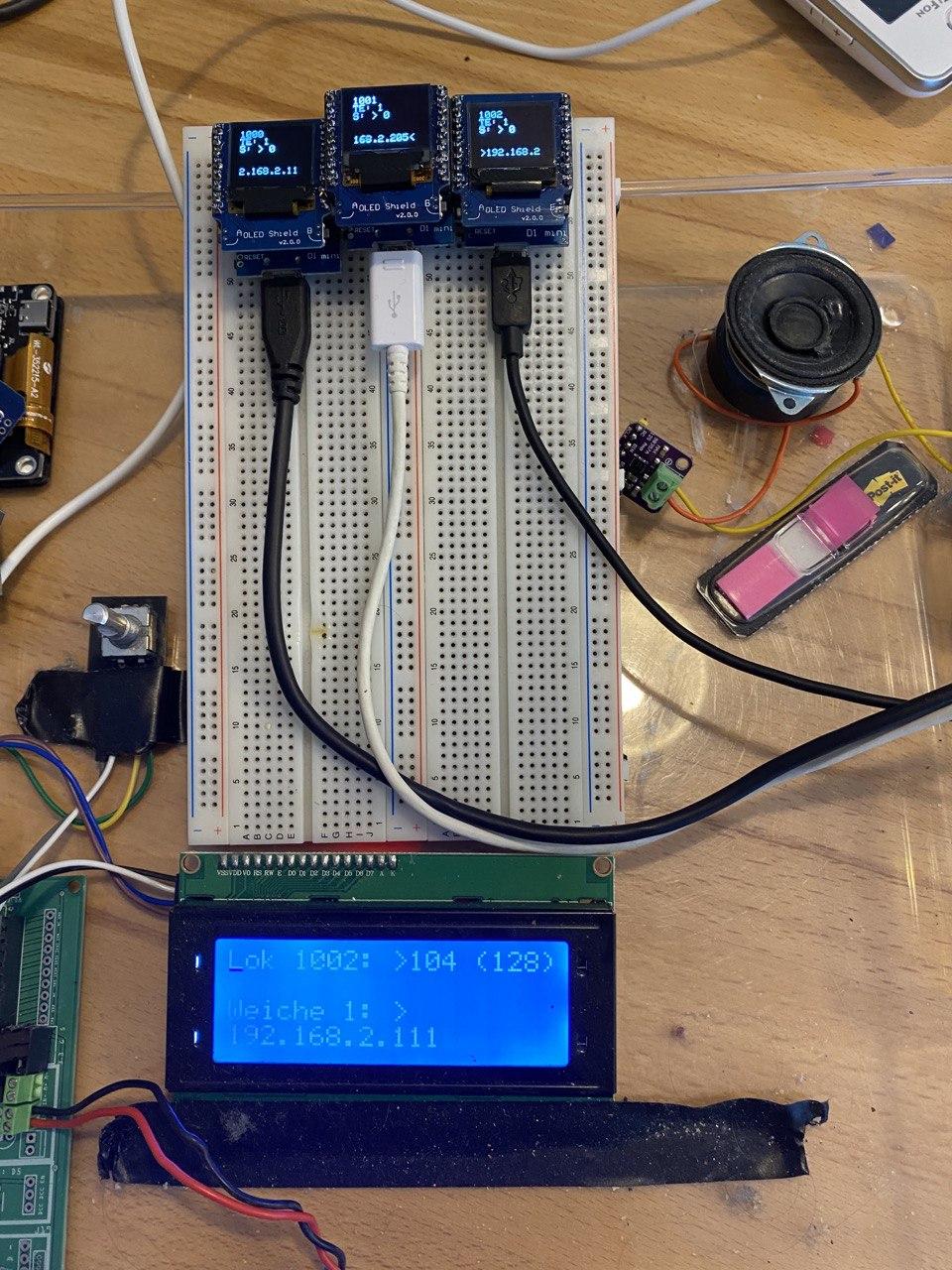 Statt DCC-Decodern habe ich jeweils ein Oled genutzt, auf dem die Informationen für den jeweiligen ESP8266 angezeigt werden.