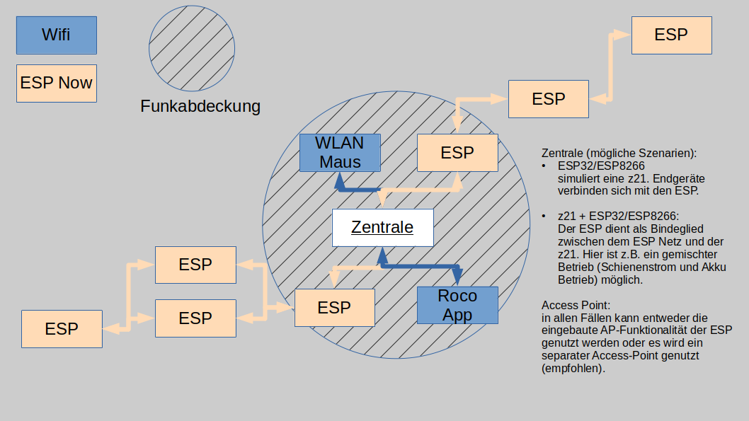 • ESP-Now funktioniert nur, wenn alle Komponenten (Steuergeräte, Endgeräte [=Loks,..]) es unterstützen.