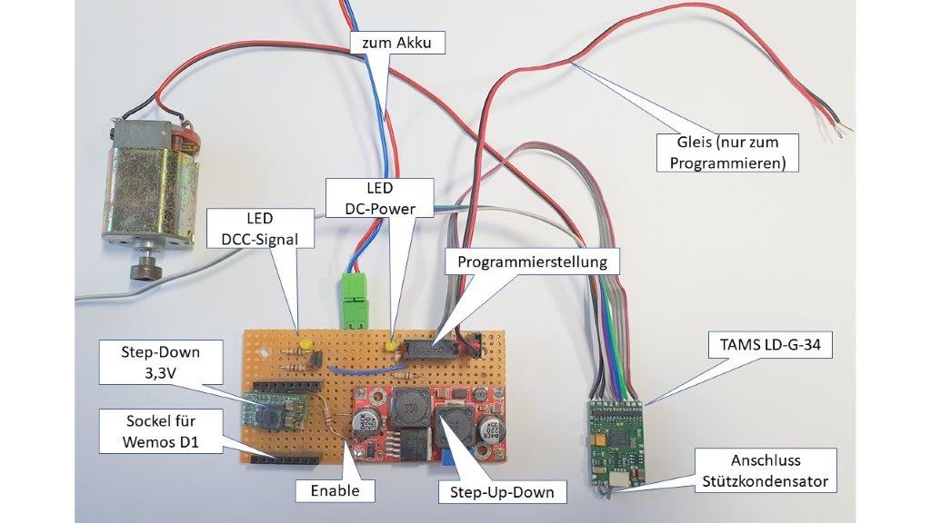 Der Step-Up-Down wird hier verwendet und es funktioniert so, wie auf dem Bild zu sehen, z.B. in meinem LCE (mit zwei Motoren ! - und schon seit 3 Jahren ....). Der Wandler hat einen zusätzlichen "Enable" Eingang, der vom Framework gesteuert wird. Damit kann man den Decoder komplett abschalten. Bei einer anderen Lok habe ich nur einen Step-Up drin: Dann würde die Spannung natürlich mit dem "Enable aus" nur auf den Wert der DC Versorgung zurück gehen und es ist ein FET am Ausgang des Wandler erforderlich. Meine ÖBB 2095 (auch mit zwei Motoren) habe ich so gebaut und ich finde es läuft besser.